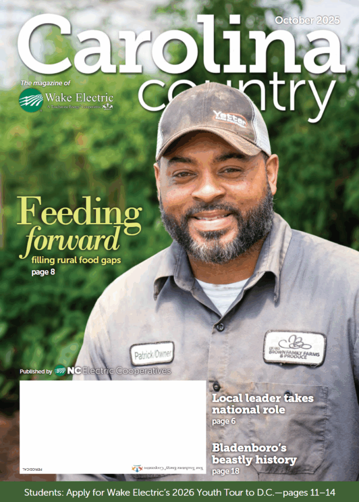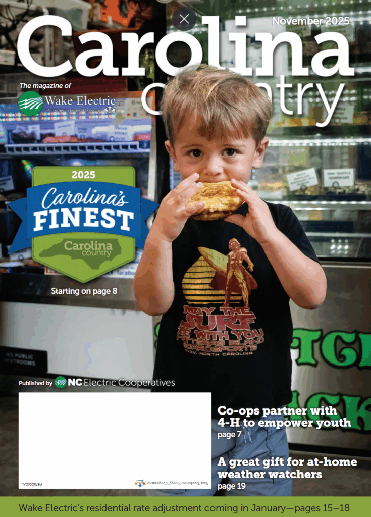 Wake Electric’s member magazine, Carolina Country, comes to your mailbox monthly and also is offered online as a flipbook version. Inside you’ll find “ElectriConnection,” a newsletter filled with information specific to Wake Electric members. Carolina Country magazine is published in Raleigh by the North Carolina Association of Electric Cooperatives, a statewide co-op serving all 26 non-profit electric co-ops in NC, including Wake Electric.